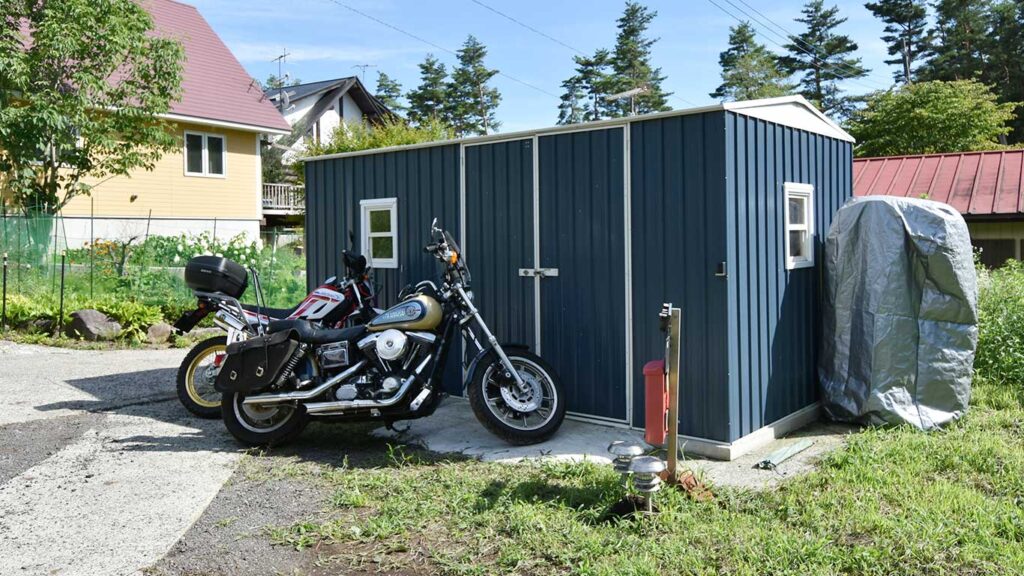 庭や玄関横にも置きやすいコンパクトな間口と奥行きで、愛車の保管場所として最適。