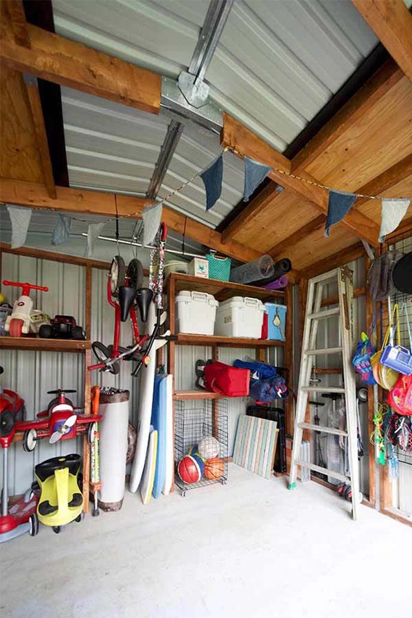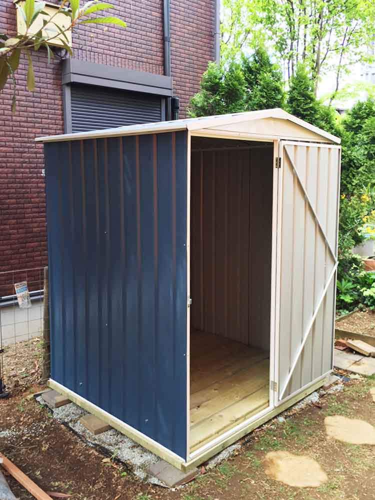 シルバーの質感、ウッドデッキの木の質感、コンクリートの無機質なイメージが見事に調和しています。床は木製床キットです。とても素敵ですね。これなら軽く収納したいものを入れておけますし、利便性も高い。湿気や熱を気にしないものなら、バンバン収納することができます。