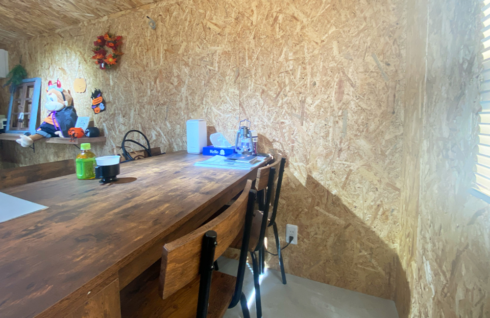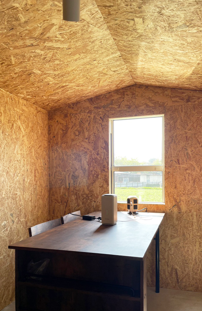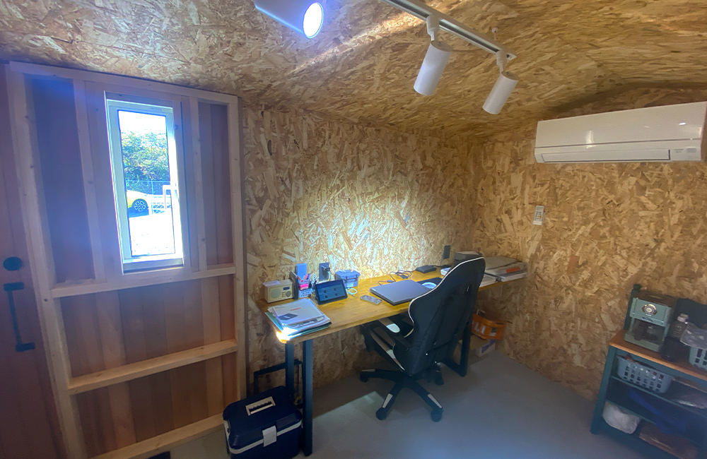 扉や窓、防犯対策の内扉などはすべて自作。断熱材を入れ、内装もスタッフの方で施工されたそうです。