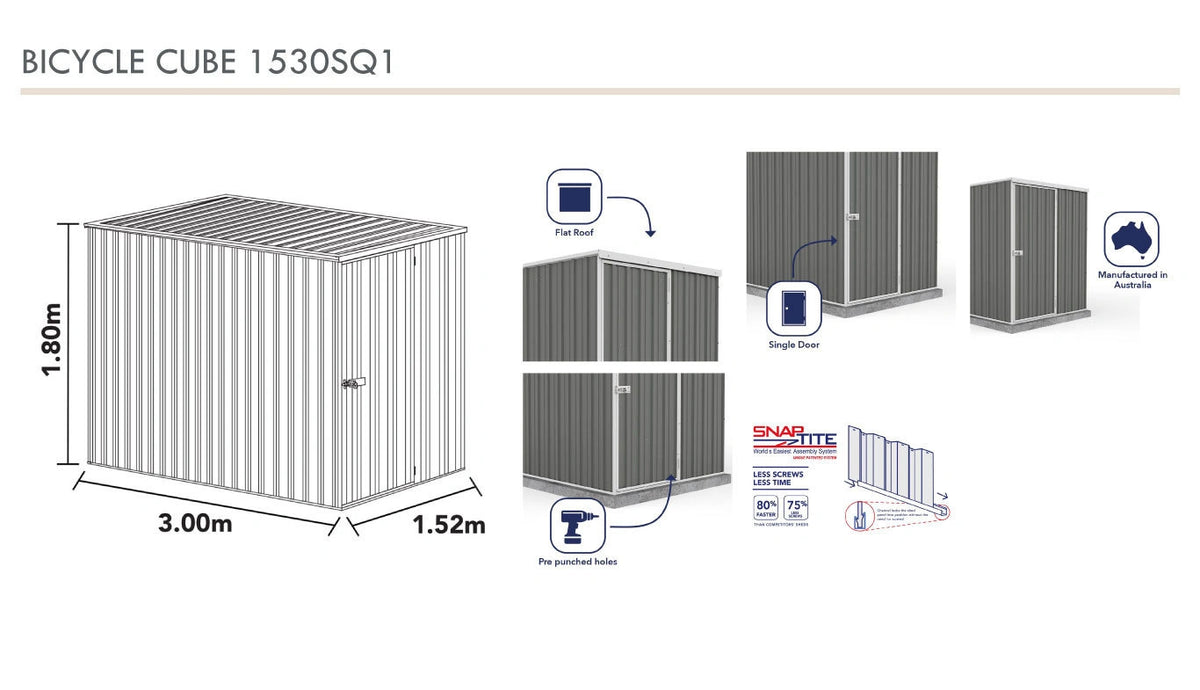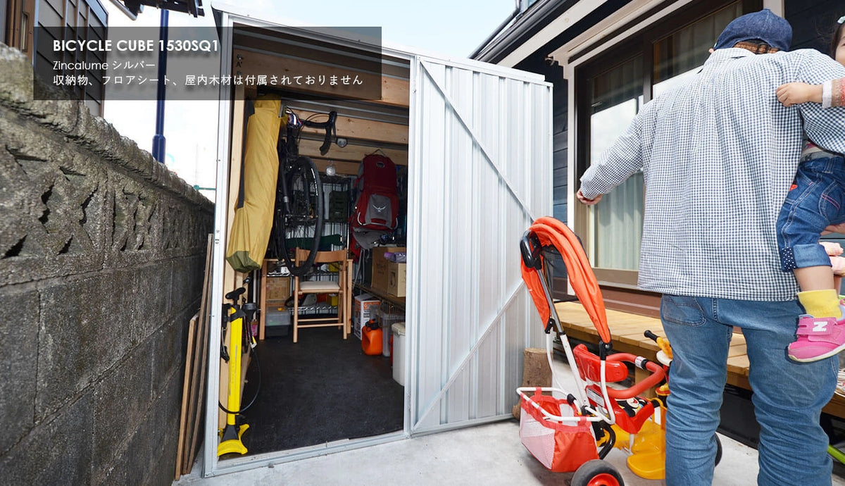 | サイズ | 間口:1520mm 奥行:3000mm 軒高:1800mm 最高高:1800mm | 開口寸法 約W750mm × H1725mm ドア枚数:1枚 | |