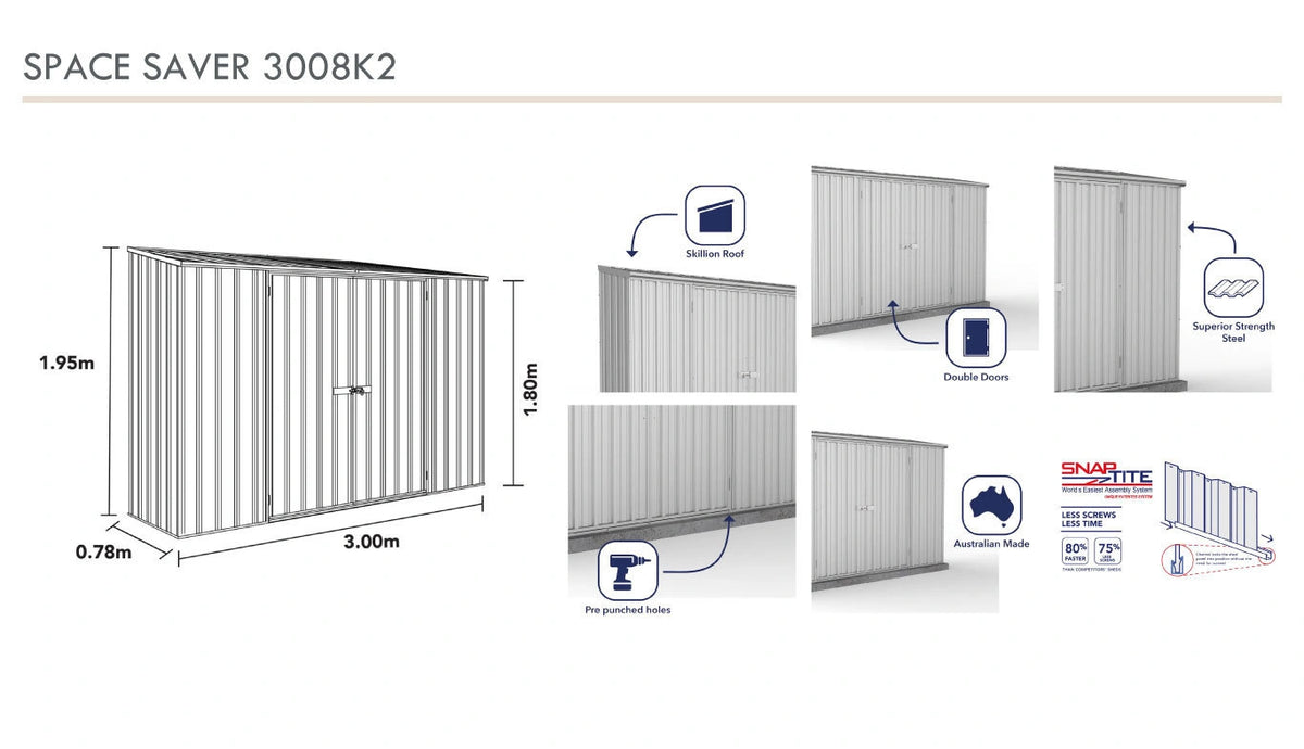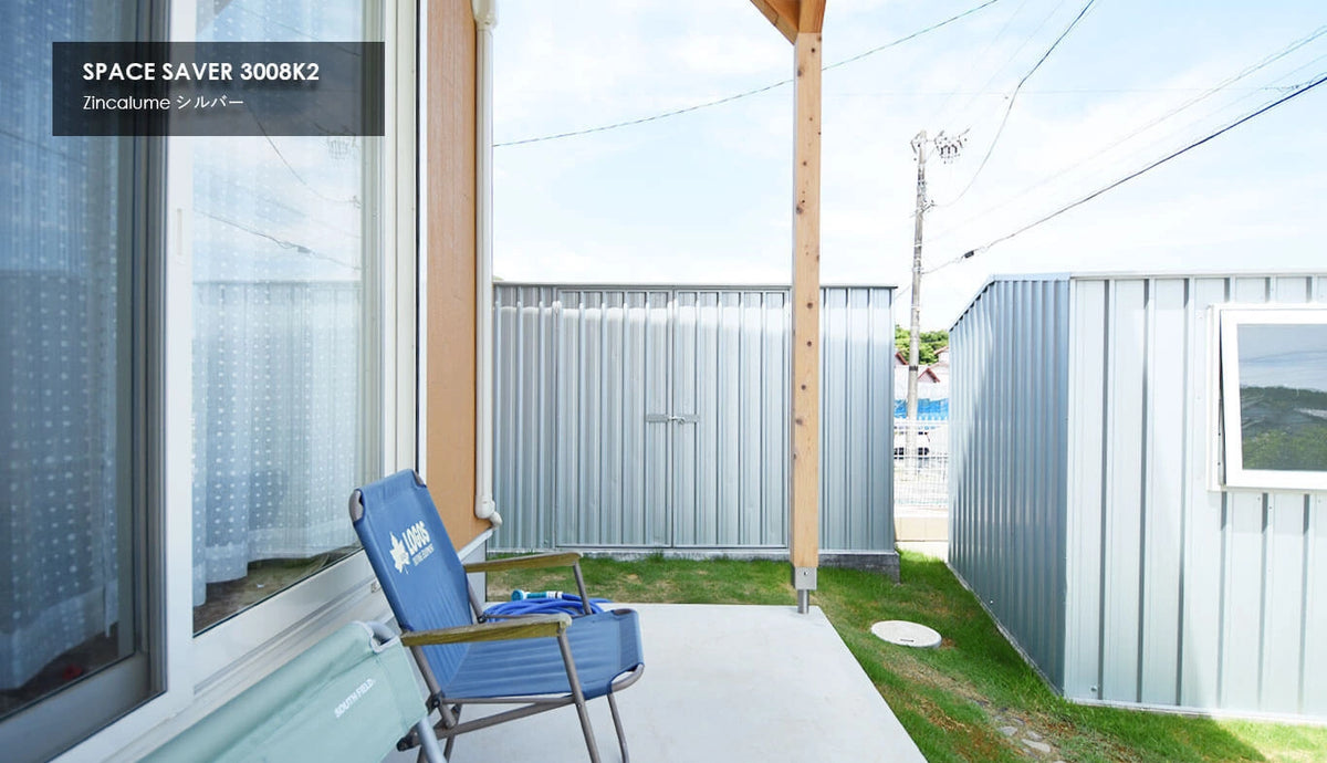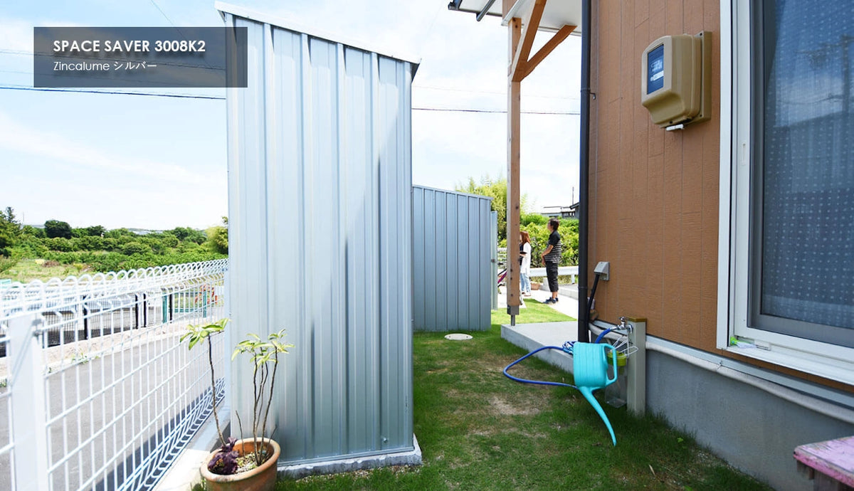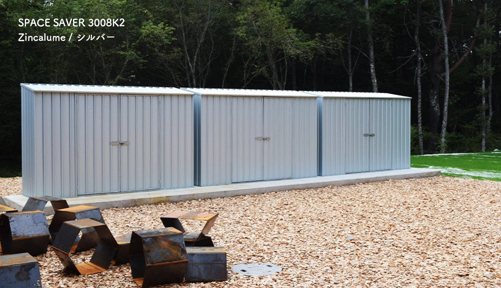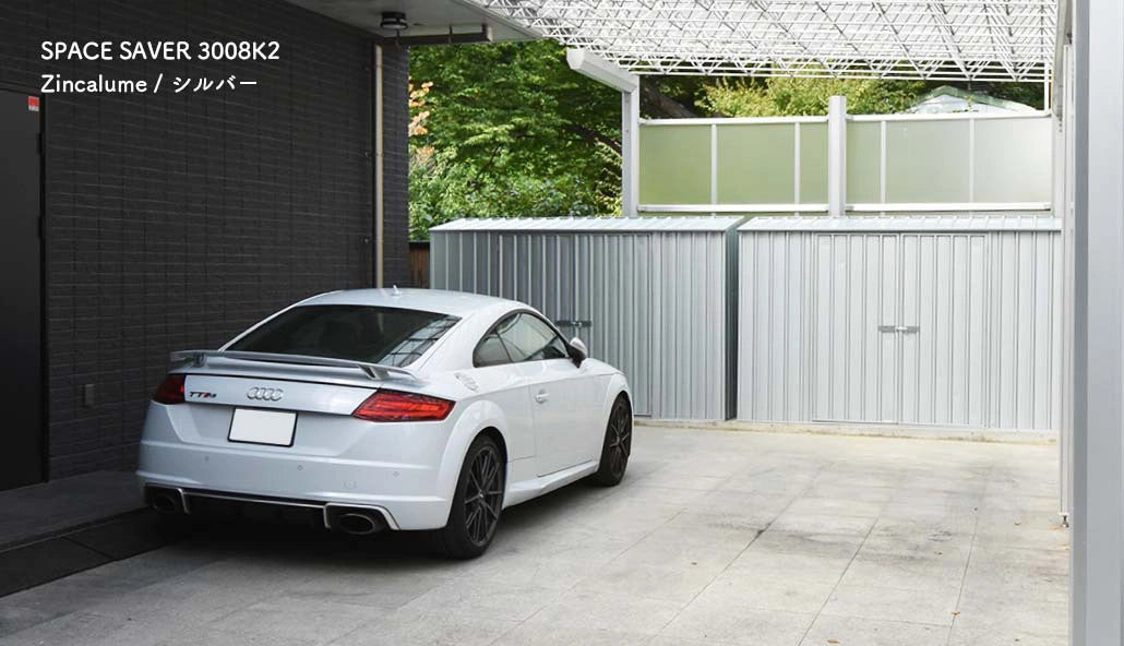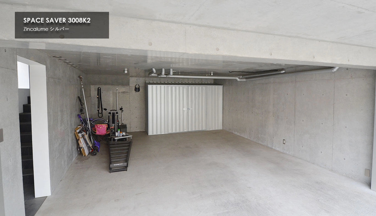 | サイズ | 間口:3000mm 奥行:780mm 軒高:1800mm 最高高:1950mm | 開口寸法 約W1500mm × H1725mm ドア枚数:2枚 | |