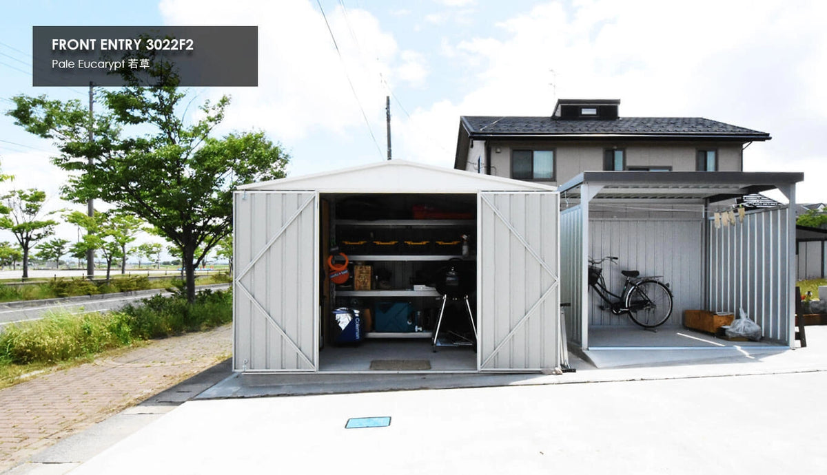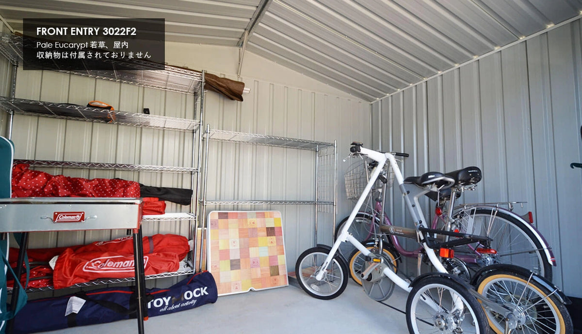 | サイズ | 間口:3000mm 奥行:2180mm 軒高:1800mm 最高高:2060mm | 開口寸法 約W1500mm × H1725mm ドア枚数:2枚 | |