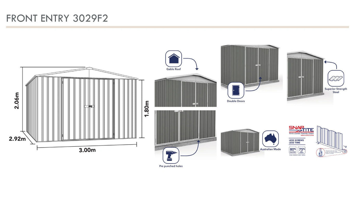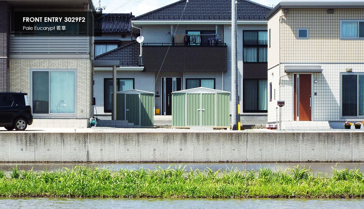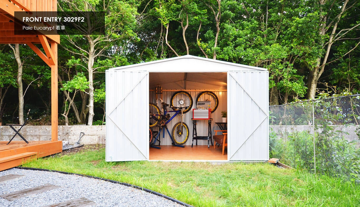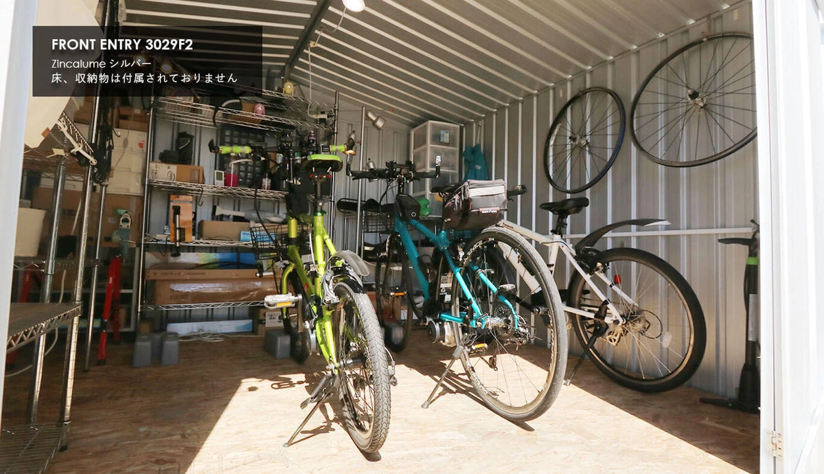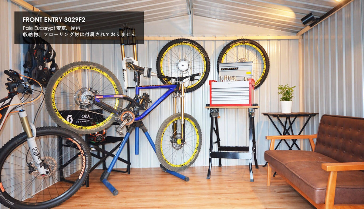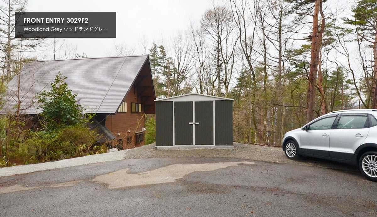 | サイズ | 間口:3000mm 奥行:2920mm 軒高:1800mm 最高高:2060mm | 開口寸法 約W1500mm × H1725mm ドア枚数:2枚 | |