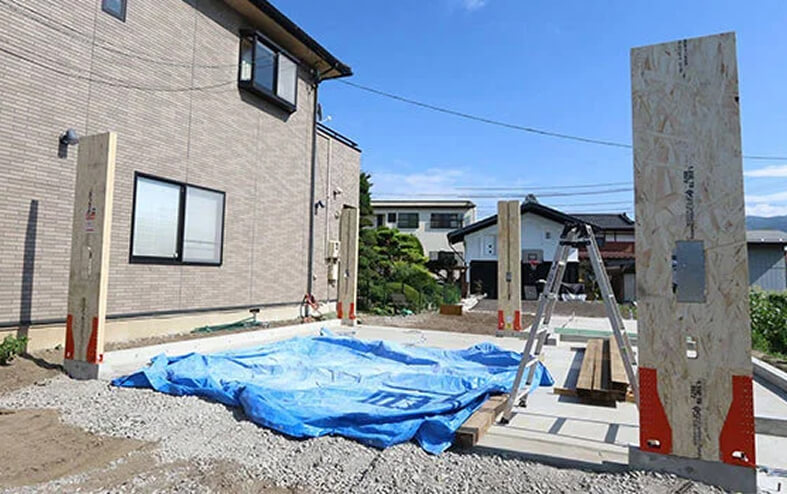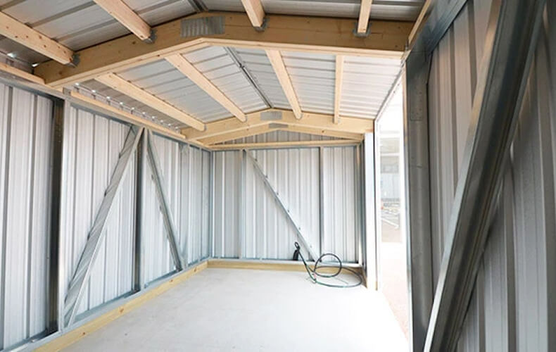 官公庁からのご依頼です。ユーロ物置®設置の際にこのハイブリット構造を用いることにより、外壁の防火性能を高めています。つまり22条(延焼のおそれある部分)への設置も適合します。さらに木質を楽しみながら車庫に必要な『内装制限』の条件をクリアするので、モーターサイクルの車庫にも適合します!(屋内が木造の壁天井では自動車車庫とはなり得ません。)